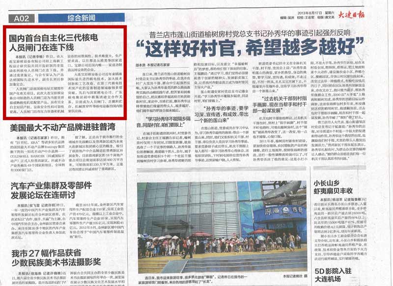 《大連日報》在2013年8月17日 A02版,以“國內首臺自主化三代核電人員閘門在連下線”為標題對大連寶原核設備有限公司“自主化非能動系列核電廠人員閘門樣機”成果鑒定會進行了報道。原文轉載如下: