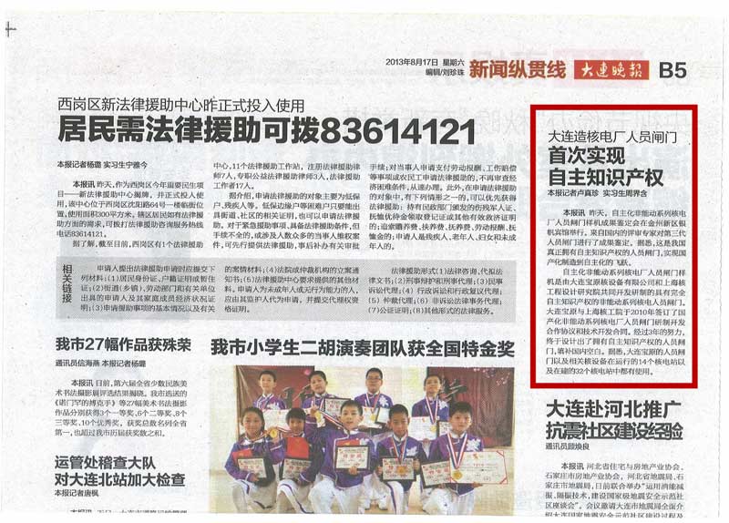 《大連晚報》在2013年8月17日 B5版,以“大連造核電廠人員閘門 首次實現自主知識產權”為標題對大連寶原核設備有限公司“自主化非能動系列核電廠人員閘門樣機”成果鑒定會進行了報道。原文轉載如下: