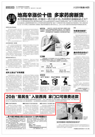 《半島晨報》在2015年6月16日A23版,以“20臺‘易民生’入駐西崗,家門口可繳費還款”為標題對大連迅通網絡技術有限公司“易民生”智能終端進行了報道。原文轉載如下: